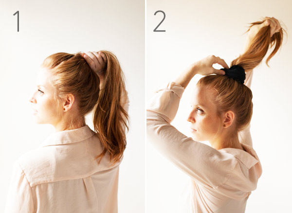 2. Teraz vezmi hrubú gumičku do vlasov a urob si vrkoč na temene hlavy.