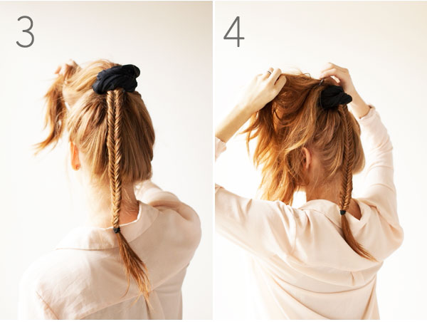 3. Vezmi si jeden prameň zo spodu vrkoča. Rozdeľ ho na dve časti a urob rybí vrkoč – ak nevieš ako sa robí rybí vrkoč, je pod týmto návodom.