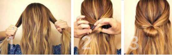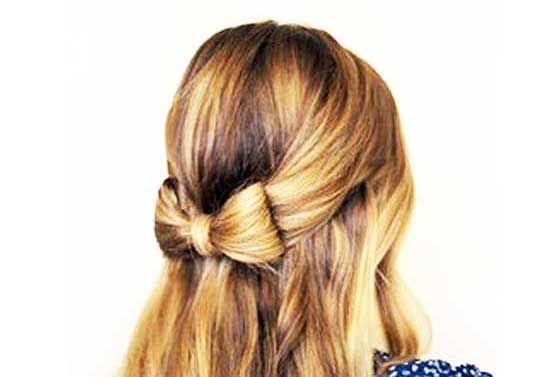 6. Zober si do prstov zvyšok “konského” copu, ktorý sme robili v prvom kroku. Tento prameň obtoč okolo gumičky podľa obrázku, tak aby si ju zakryla. Nakoniec použi sponky pre zafixovanie mašľe, tak aby ich nebolo vidieť.